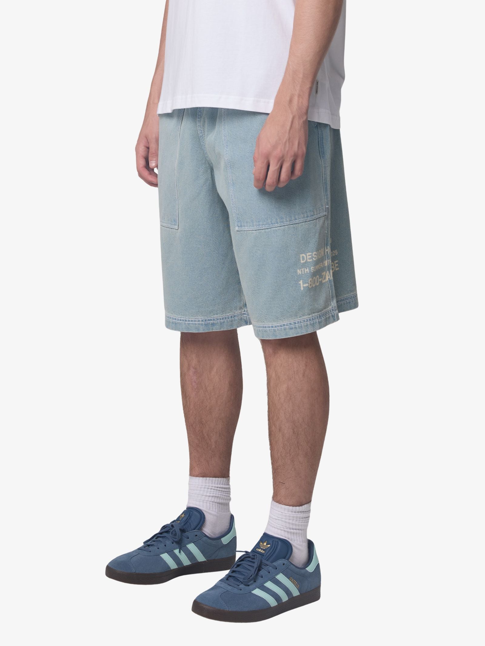 The Design House Denim Shorts by Zanerobe offer a contemporary take on classic denim, crafted from lightweight cotton denim. They feature a relaxed, wide leg silhouette with a standard rise and an elasticated waist. The design includes large patch pockets with flatlock stitching and a multi-placement screen print.