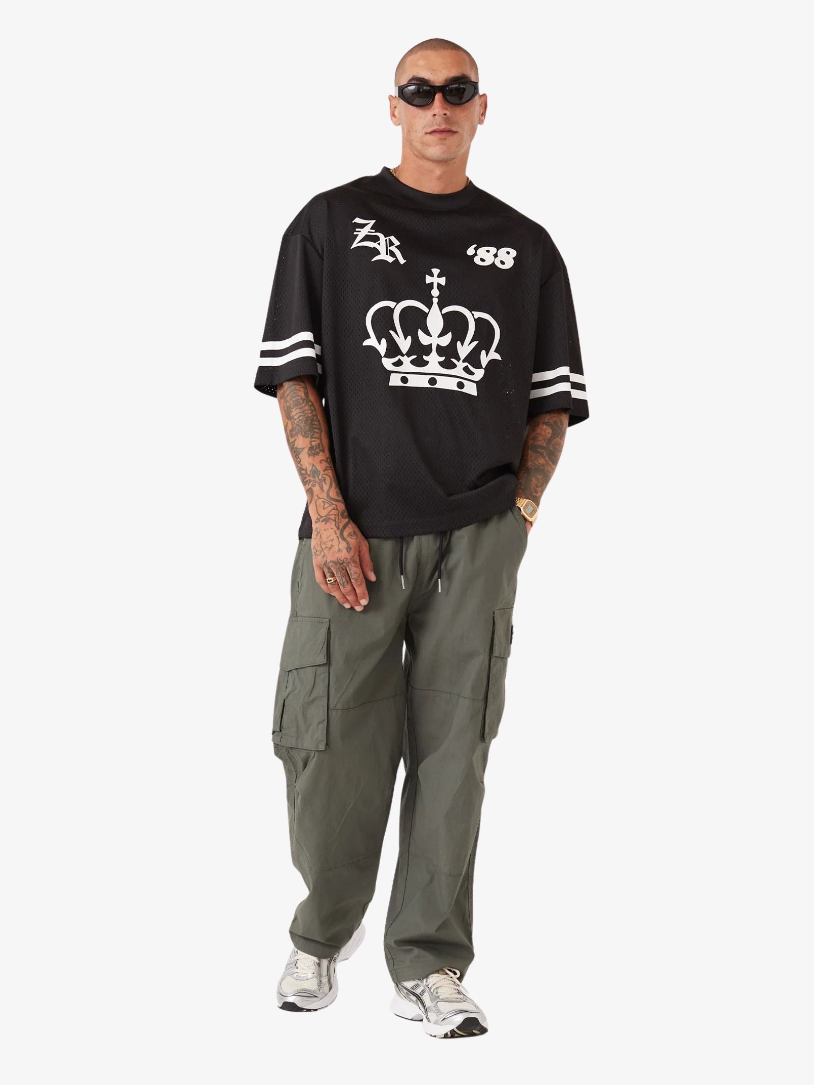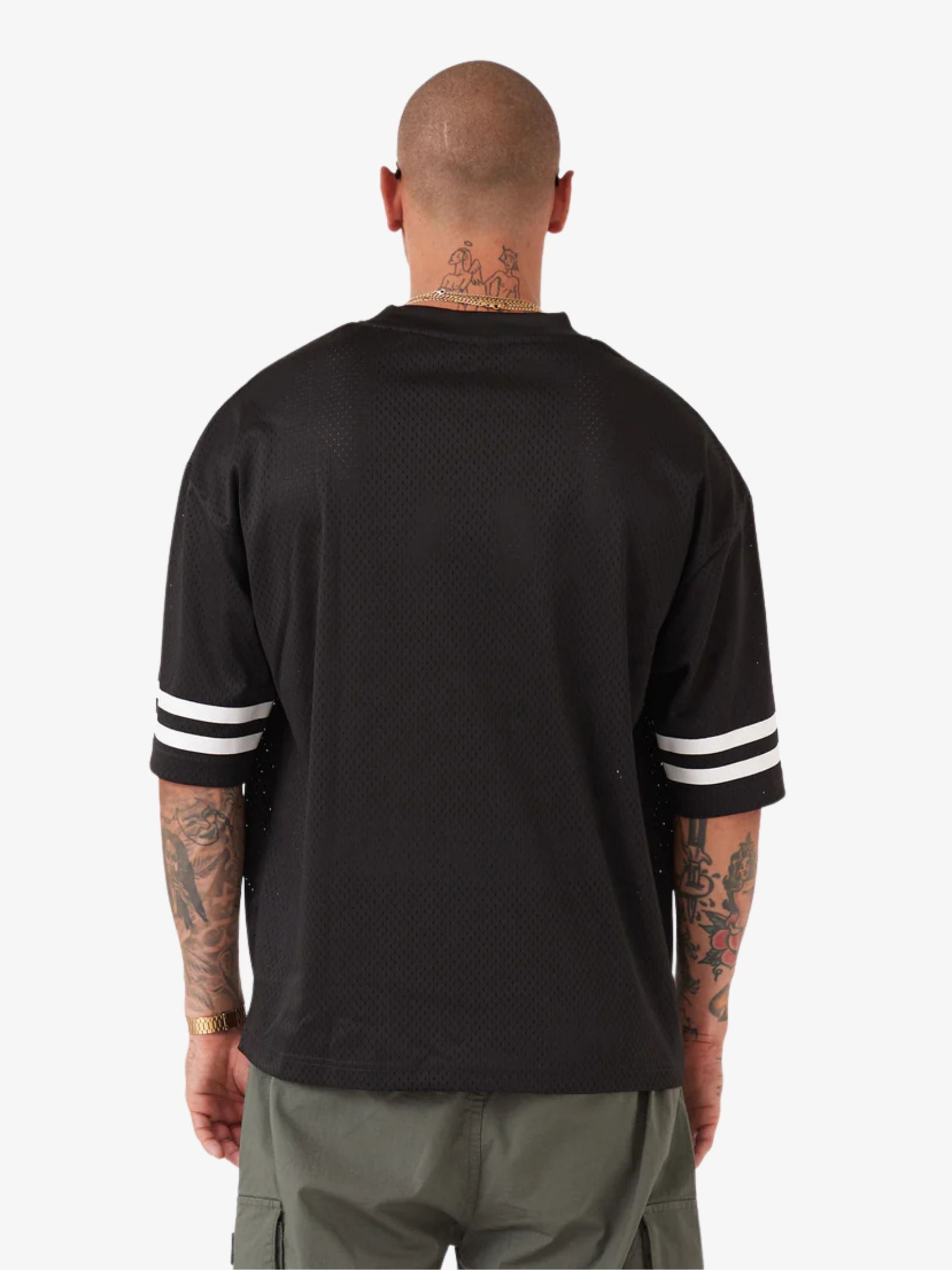 The Mesh Baseball Tee by Zanerobe is a lightweight, breathable poly mesh top featuring an oversized fit, dropped shoulders, and a plastisol graphic on the chest.