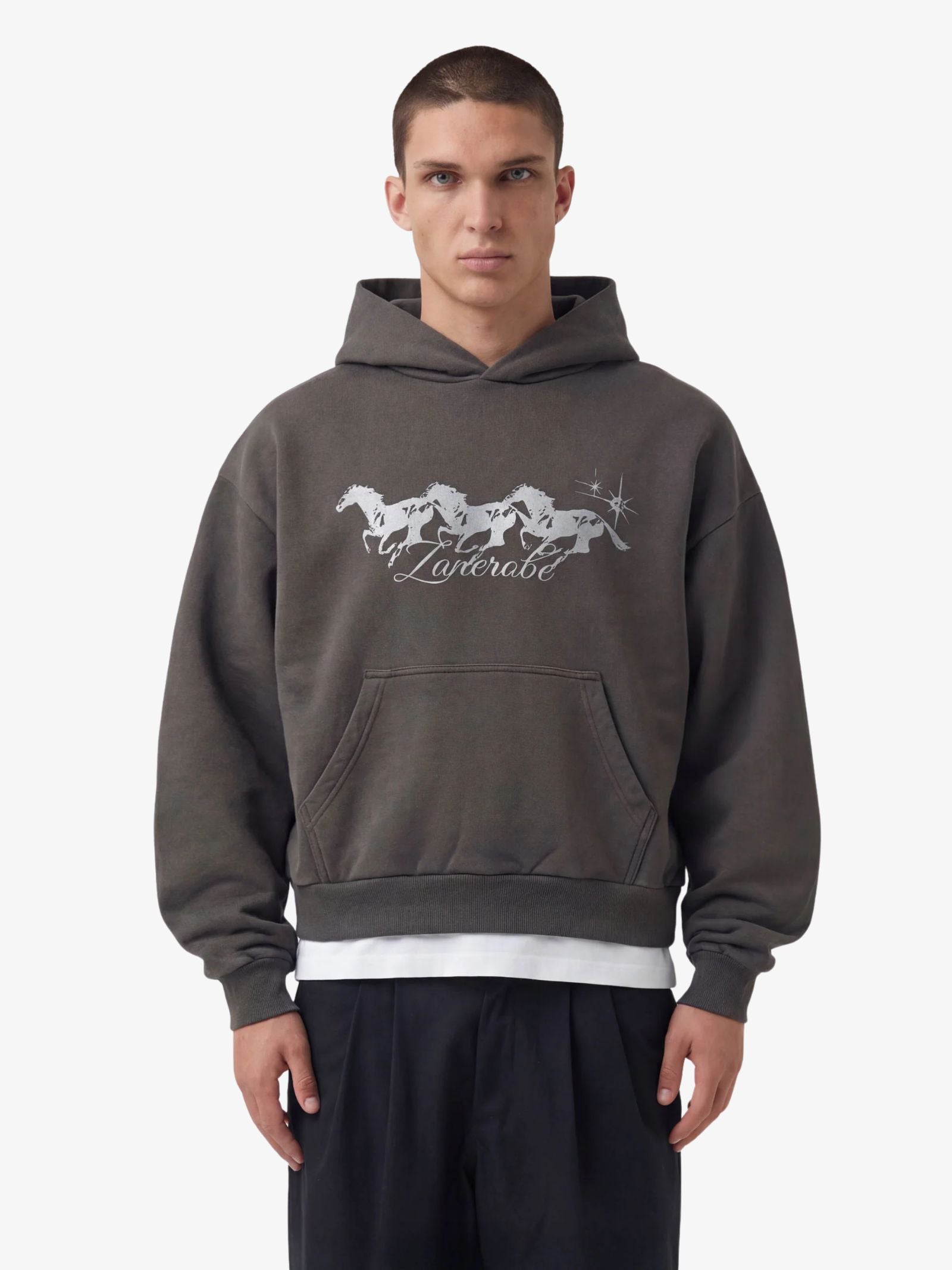 The Stallion Box Crop Hood by Zanerobe is a heavyweight sweatshirt featuring a wide, cropped silhouette. Constructed from a brushed-back fleece blend, it includes a generously proportioned hood designed with minimal stitching for a clean aesthetic. The design is finished with a bold 'Stallion' plastisol print across the chest and the brand's signature 'X' stitch at the side seam.