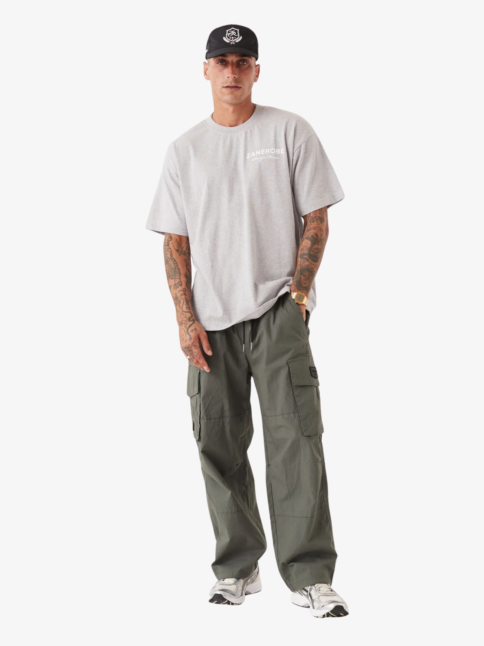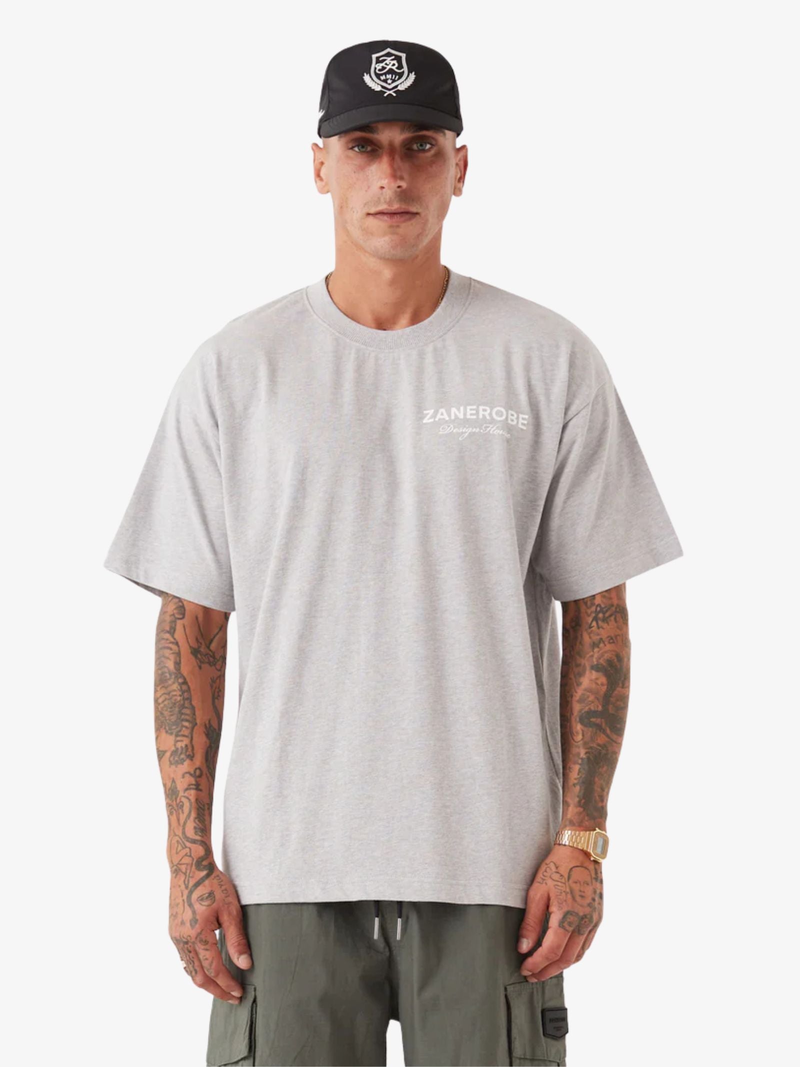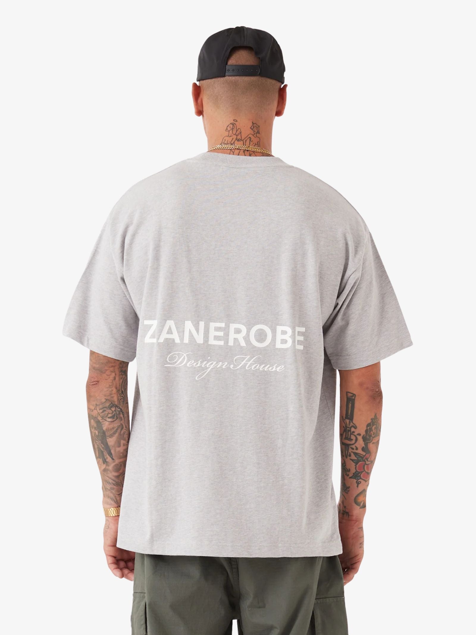 The Zdh Box Tee by Zanerobe is a premium, heavyweight top made from cotton, featuring a boxy silhouette, wide sleeves, and a plastisol graphic on the front and back.